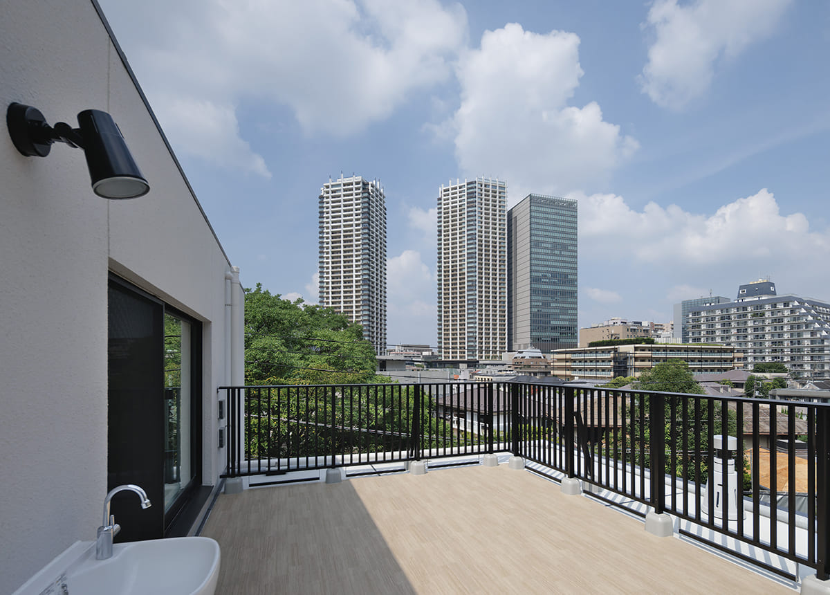 バルコニーから望む高層ビル群も